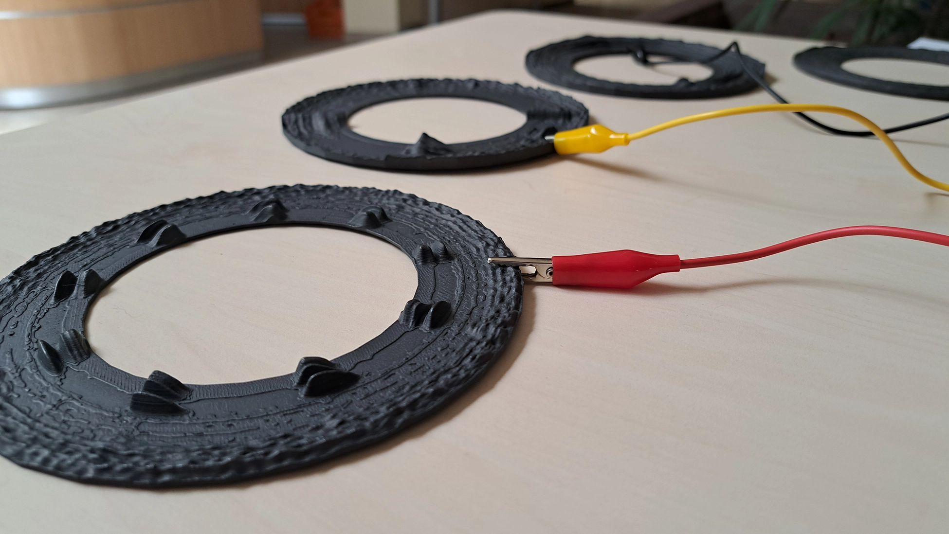 Pour finir, le collectif s’est intéressé à la matière sonore qui peuple le laboratoire GREMI où cohabitent de multiples pompes, laser, boutons en tout genre. Des bruits de fond pour les chercheurs, mais bien plus particuliers pour les non initiés. Cherchant à mettre en valeur ces sons qui deviennent le quotidien des acteurs de MATEX, le collectif a l’idée de créer un dispositif d’écoute, mais aussi de jeu interactif de ces sons. Après une phase d’enregistrement en laboratoire, elles modélisent des visualisations de ces sons qu’elles impriment en 3D dans l’espace tangible. L’exposition met donc en scène un dispositif tactile permettant de jouer les sons enregistrés en touchant les modules imprimés en 3D correspondants.