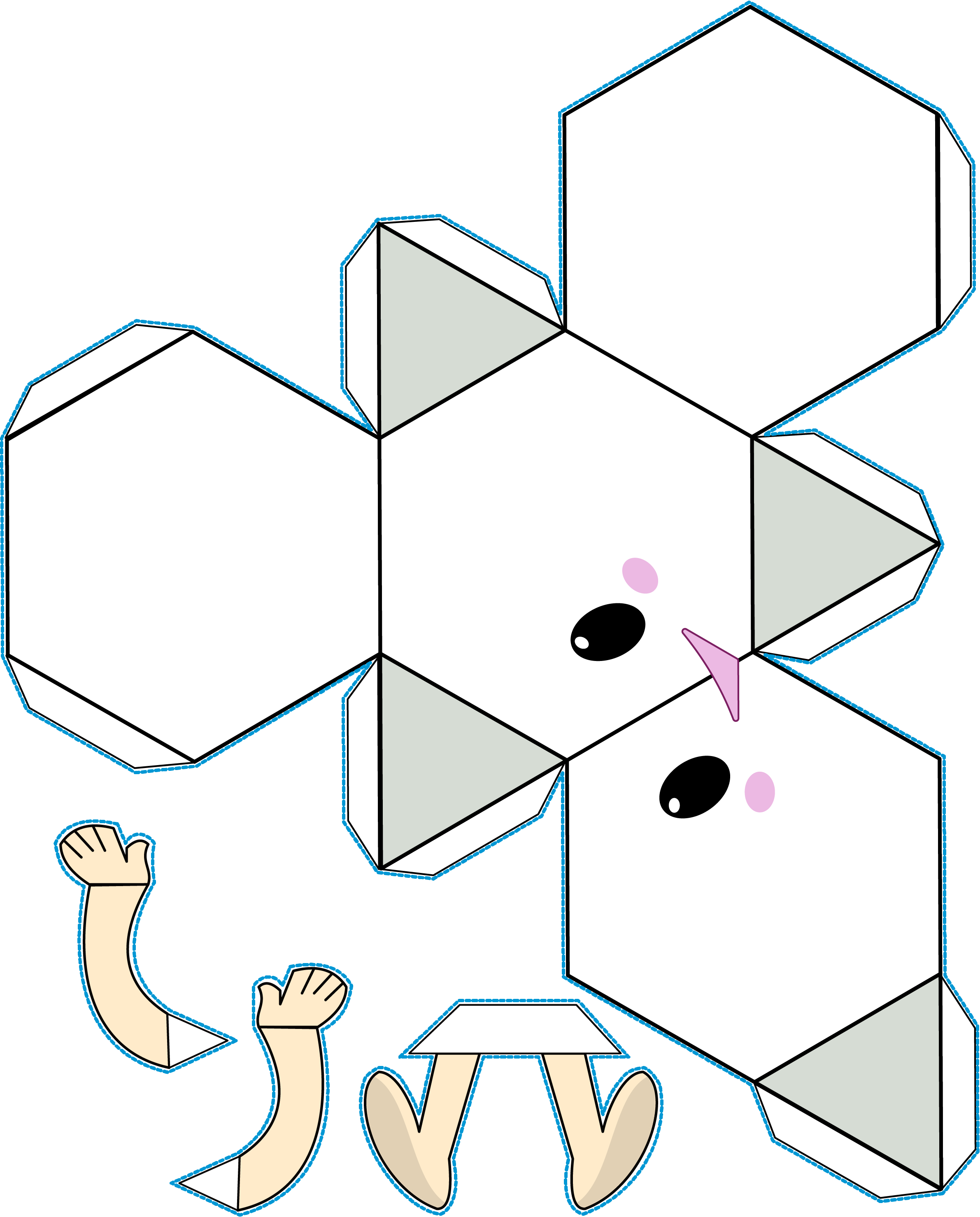 - Découpez le patron de Poly en suivant les traits noirs, le long du contour bleu,
